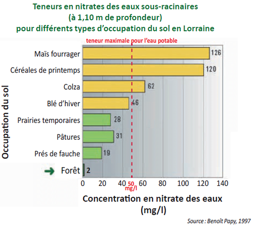 En forêt, les teneurs en nitrates dans les sols sont largement inférieures à d’autres types d’occupation du sol (agriculture, pâtures, prairies temporaires …). Une étude sur des bassins versants a d’ailleurs montré qu’un taux de boisement de 30 % permettait de respecter les normes de teneurs en nitrates pour l’eau potable.